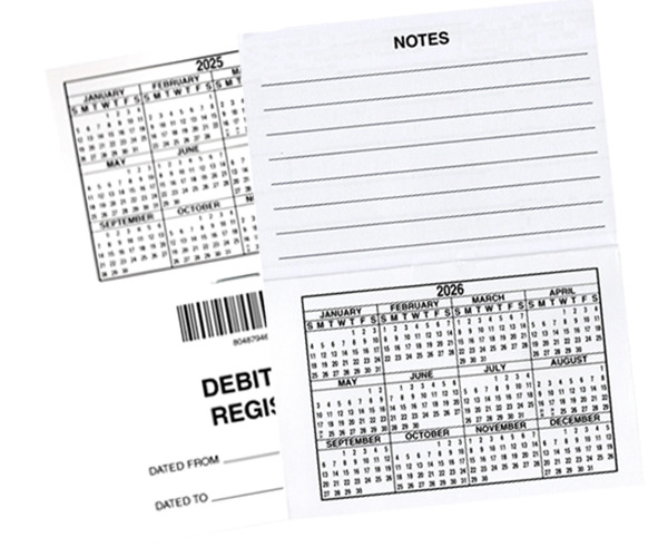 Debit Register has 32 Pages with 2 Year Calendars on the Back.